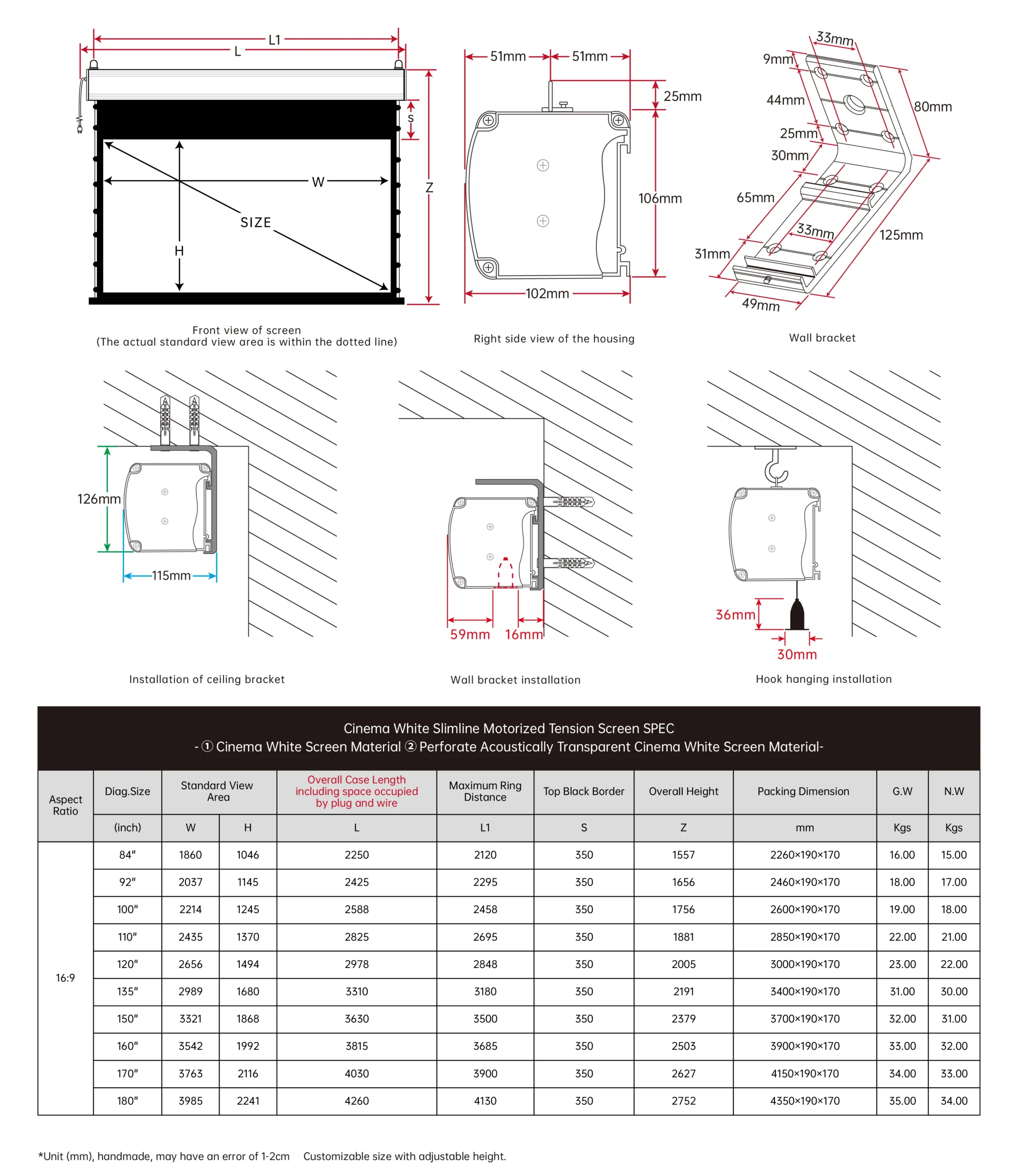 Kích thước: 135 inch tỷ lệ 16:9