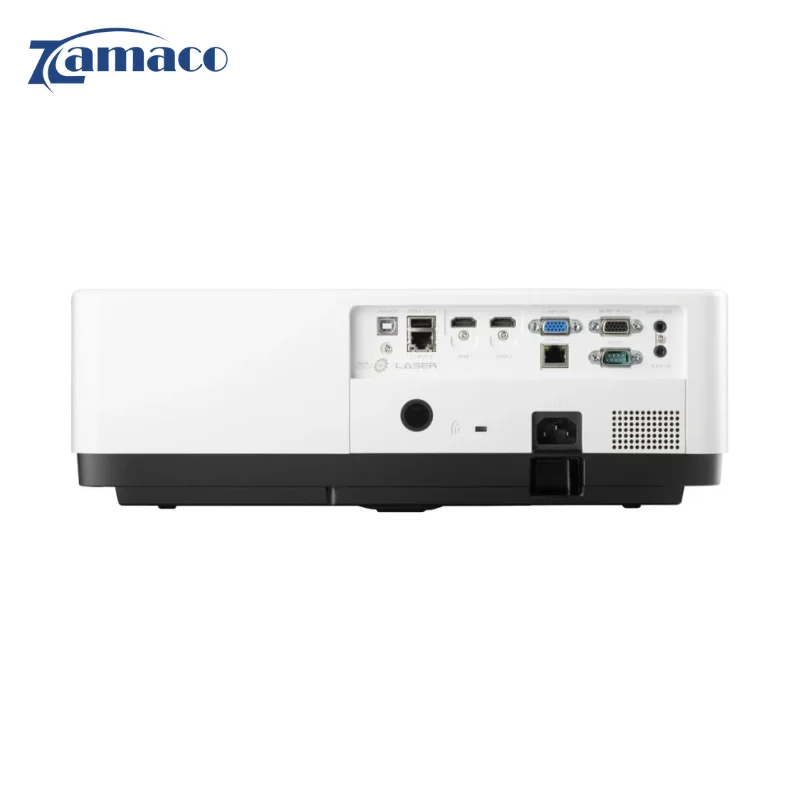 Máy chiếu tích hợp LAN control và hỗ trợ các giao thức quản lý trung tâm như Crestron, PJ Link, ATEN và Extron, giúp dễ dàng quản lý nhiều thiết bị trong hệ thống. Ngoài ra còn có các cổng kết nối tiêu chuẩn như HDMI, VGA, USB-A, Audio in/out, RS232 và RJ45.